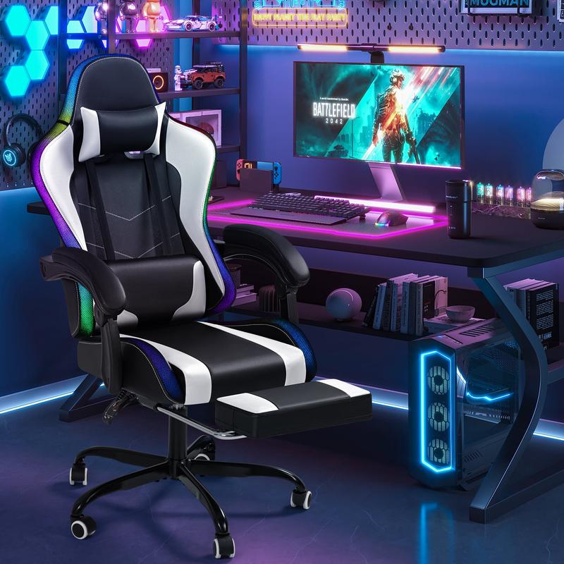 ·【RGB Lights】The backrest and seat edges of this gaming chair are equipped with embedded RGB LED light strips, allowing you to effortlessly adjust various lighting modes and brightness levels using a remote control. Create your desired gaming atmosphere and infuse energy into your entertainment sessions.